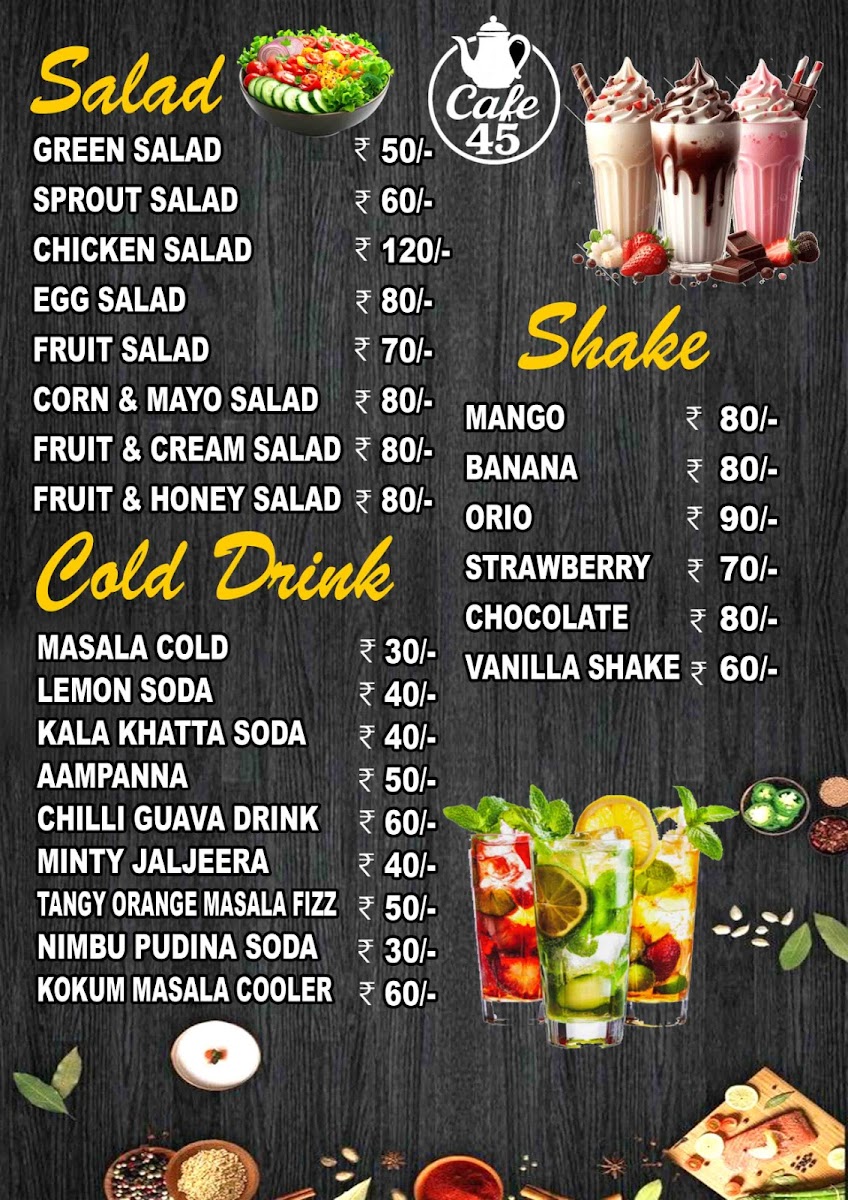 Welcome to Cafe 45, the vibrant new hangout spot in Khandapada, Odisha! This cafe promises a delightful escape with its diverse menu that caters to all tastes. Whether you're in the mood for creamy shakes like Mango, Chocolate, or the refreshing Strawberry, Cafe 45 has you covered. For cold drink enthusiasts, options such as Masala Cold and Kokum Masala Cooler will tickle your taste buds.